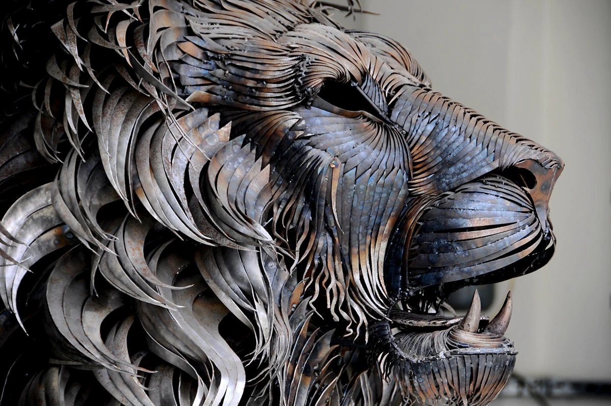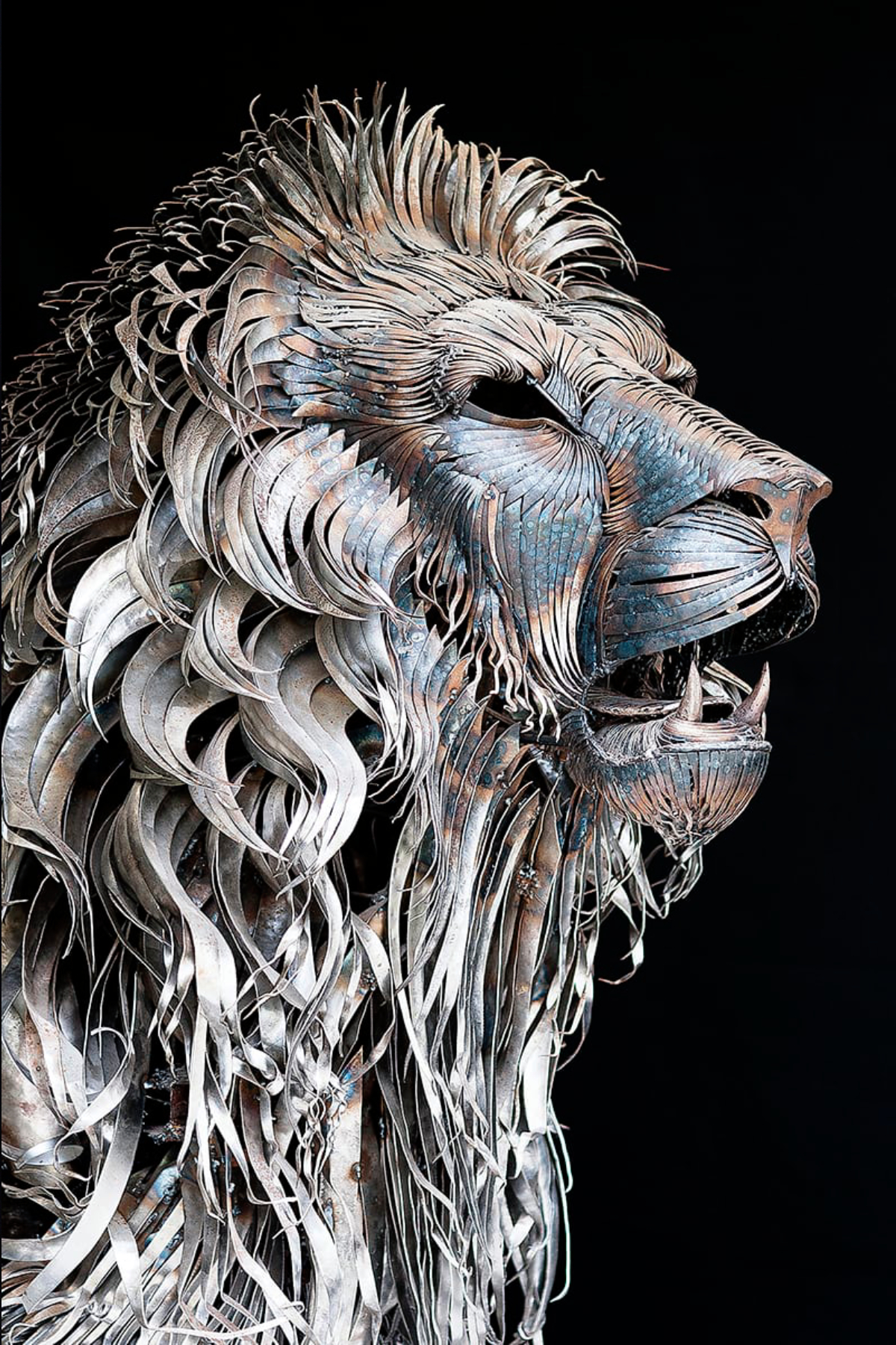 Aslan is a monumental lion sculpture that embodies strength, nobility, and movement. Each element is individually cut and shaped by hand, then assembled from within to form a unified structure. The visible traces of hammering and welding celebrate the process itself, transforming raw metal into a living presence.